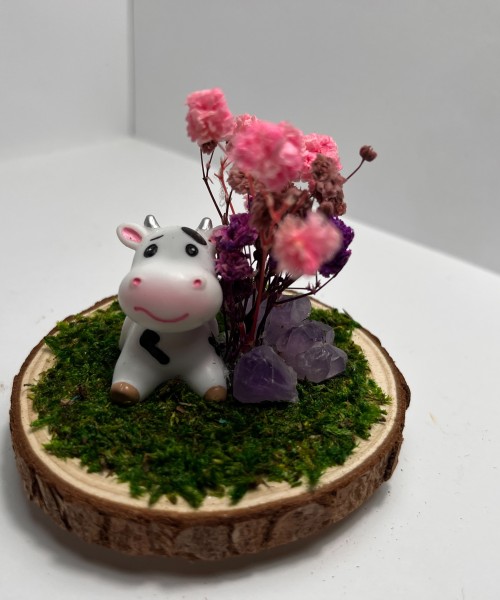 Sitting Cow - Natural Amethyst Stones, Pink, Violet, Purple Flowers with Green Grass.