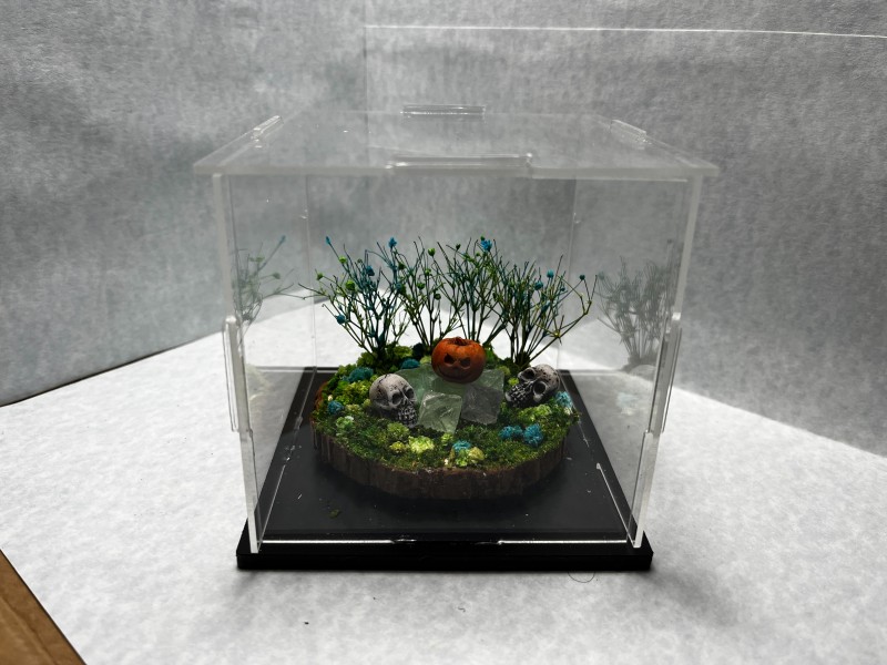 Pumpkin & Skulls - Fluorite Crystals, Green and Teal Flowers and Trees, Green Grass. Display Case