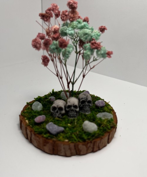 Three Skulls Resting Under a Violet & Aqua Flowered Tree, Surrounded By Grass & Fluorite Stones