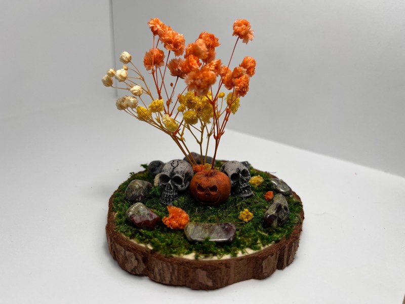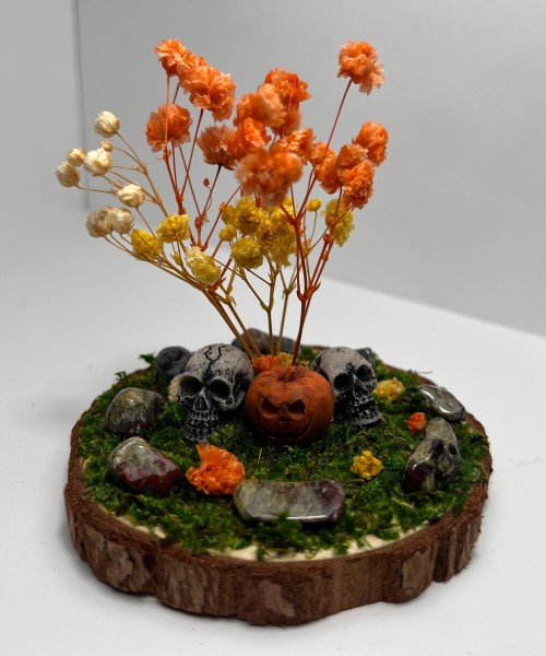 A Patch Of Skulls With A Pumpkin, All Under A Yellow, Orange and White Flowered Tree. All Encircled By Natural Dragon Blood Stone Quartz