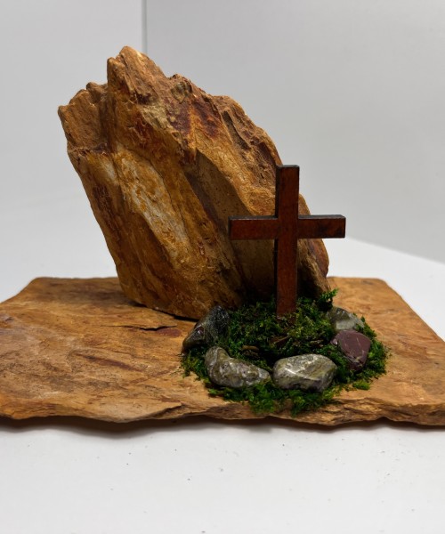 A cross on a mound of grass, surrounded by Natural Dragon Blood Stone Quartz, mounted on rocks.