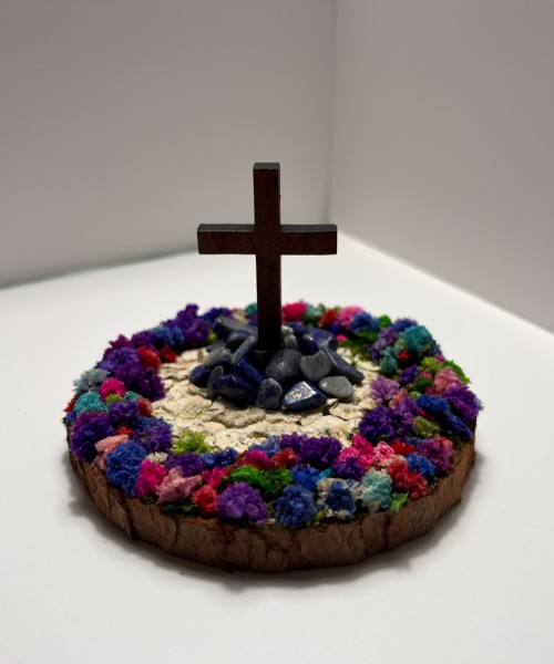 A Cross With A Base Of Lapis Lazuli Natural Stones, Surrounded By A Boutique Of Colorful Flowers.