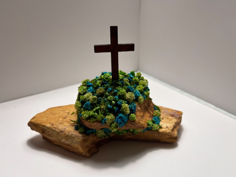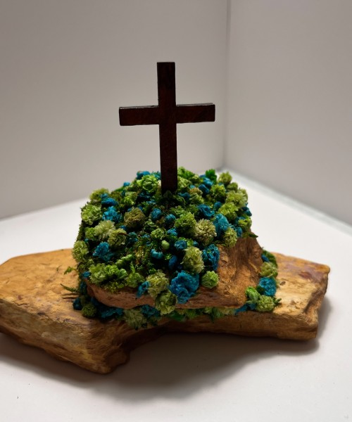 A Cross On Top Of The Mountain, Surrounded By Plush Green And Teal Flowers On A Bed Of Grass