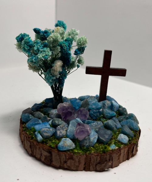 A Cross Surrounded by Blue Apatite Crystals, Next To A Tree of Aqua & Teal Flowers, and a couple of Natural Amethyst Crystals.